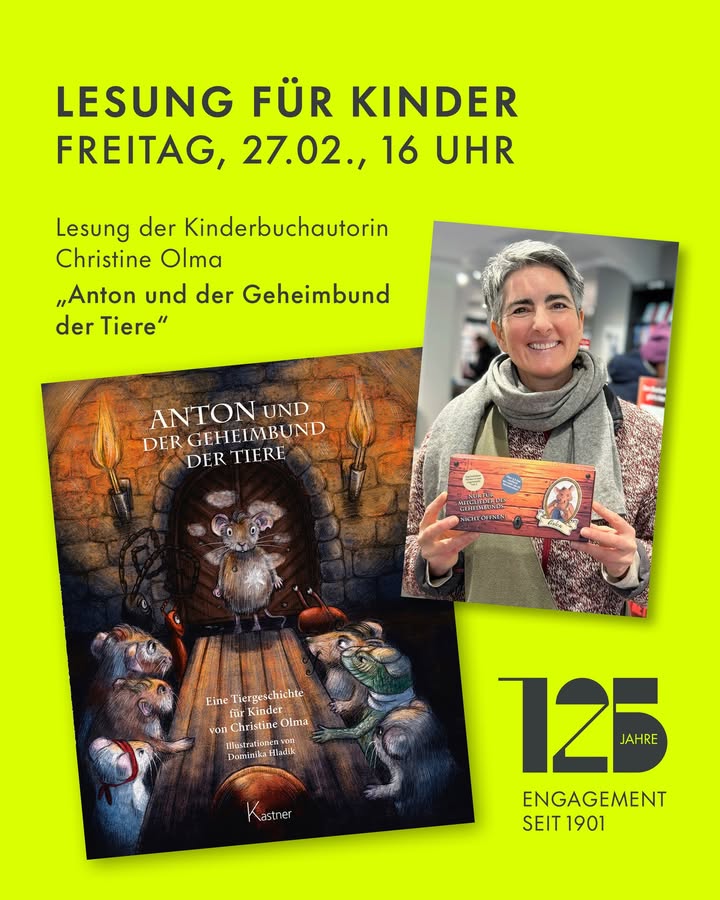Am Freitag, 27.02. ab 16 Uhr liest Kinderbuchautorin Christine Olma aus „ Anton und der Geheimbund der Tiere“ 🐾📘