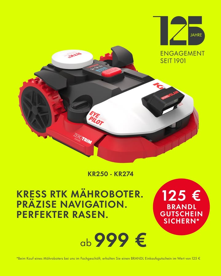 und 125 € BRANDL Einkaufs-Gutschein beim Kauf eines KRESS Mähroboters.