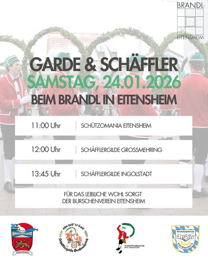 Am Samstag, den 24.01.2026 begrüßen wir nicht nur die Schützomania Eitensheim, sondern auch die Schäfflergilde Großmehring und die Schäfflergilde Ingolstadt. Für das leibliche Wohl sorgt der Burschenverein Eitensheim.