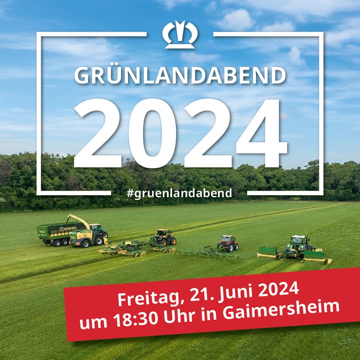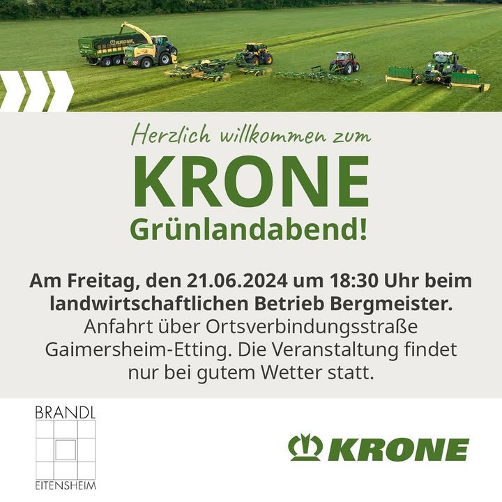 Verpassen Sie nicht die Maschinenvorführungen beim Krone Grünlandabend am Freitag, den 21.06.2024 um 18:30 Uhr beim landwirtschaftlichen Betrieb Bergmeister in Gaimersheim. Für das leibliche Wohl ist bestens gesorgt. Wir freuen uns auf Ihren Besuch! 🌾👩🌾🚜